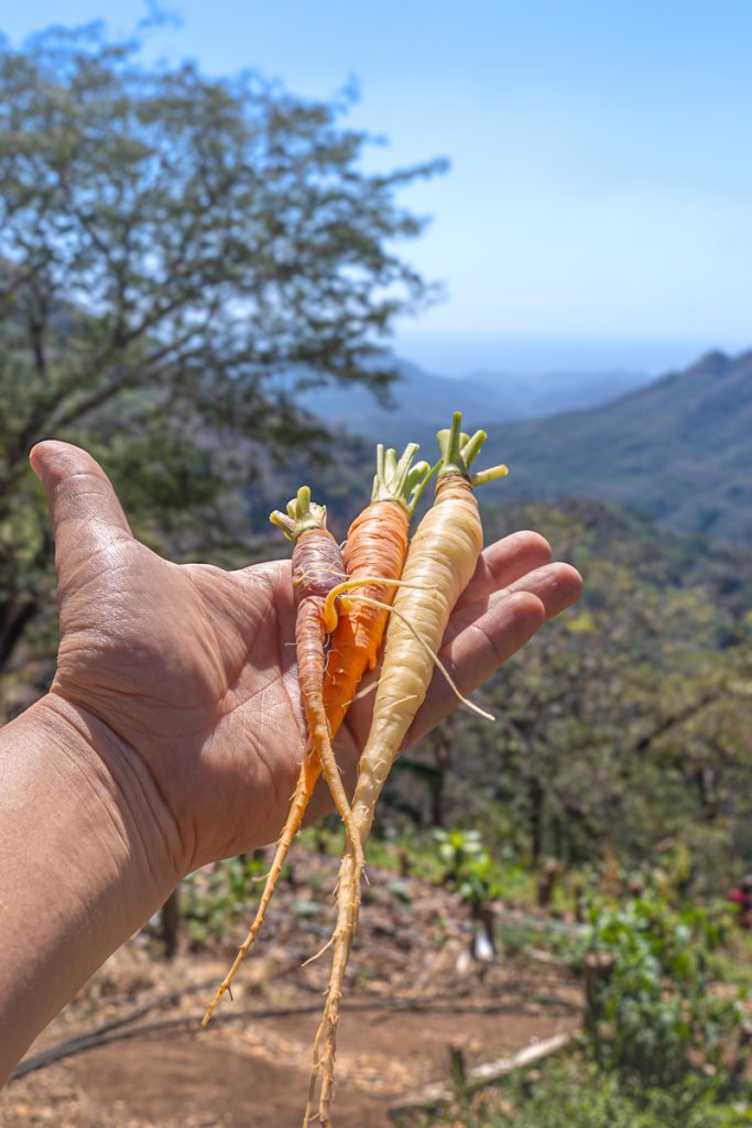 De igual manera, cosecha zanahorias, tomates cherry, chiles de toda clase, zacate de limón, sandías, verdolagas, pitahaya y berenjenas.  Y gracias al talento culinario de su esposa, también vende productos como pestos de albahaca, salsas de chile y pasta de achiote, todos a partir de ingredientes naturales.