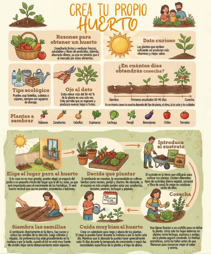 Este tipo de huerto consiste en cultivar plantas en macetas, cubetas o cajones, lo que lo hace ideal para casas con poco espacio, balcones o patios pequeños. Se ajusta fácilmente porque las macetas pueden moverse según la cantidad de sol o el clima que necesiten. En él se pueden sembrar hierbas aromáticas como albahaca, cilantro y perejil, así como hortalizas pequeñas como espinaca, chile, tomate cherry y cebollín.