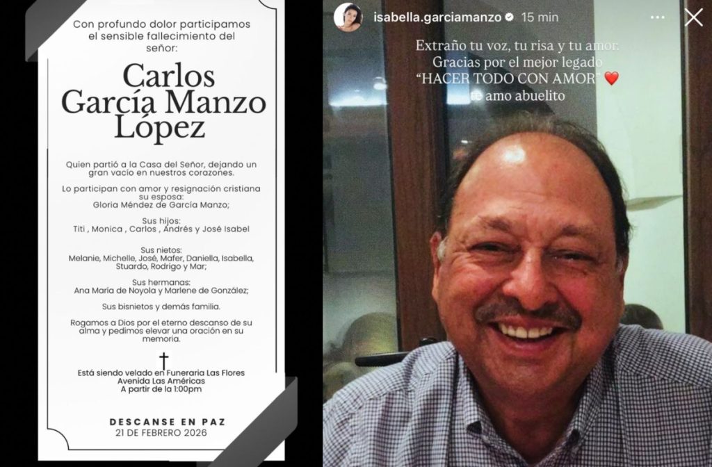 La familia García Manzo publicó una esquela del fallecimiento de su abuelo, donde se menciona al papá de la reina de belleza, Andrés García Manzo y a la reina de belleza como su nieta.