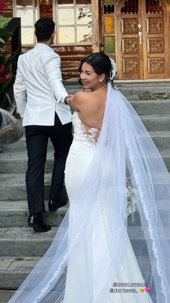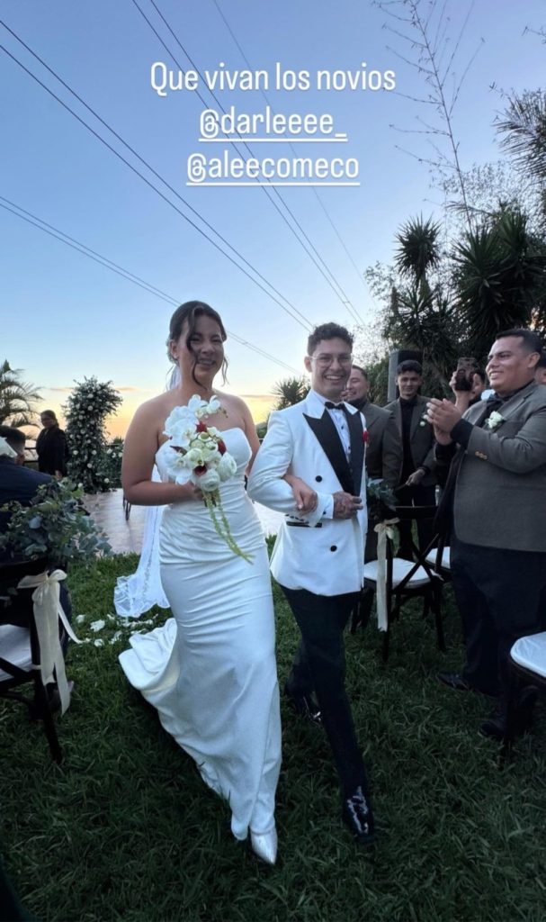 En sus historias, Aleco mostró algunos momentos destacados de la celebración. En un par de fotografías se aprecia a Darlenne luciendo un hermoso vestido blanco ajustado a su figura, acompañado de un delicado velo. Por su parte, Meco llevó un esmoquin blanco combinado con un pantalón negro.