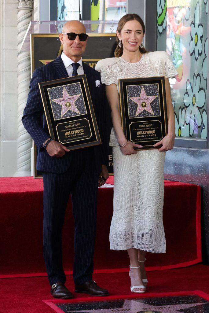 HOLLYWOOD, CALIFORNIA – APRIL 30: (L-R) Stanley Tucci and Emily Blunt are honored with stars on the Hollywood Walk of Fame on April 30, 2026 in Hollywood, California. Kevin Winter/Getty Images/AFP (Photo by KEVIN WINTER / GETTY IMAGES NORTH AMERICA / Getty Images via AFP)