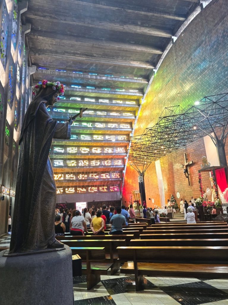 Rubén Martínez, arquitecto de esta joya, dejó de lado la estructura tipo cruz común en las iglesias y optó por una estructura tipo bóveda. Otra de sus particularidades es que esta iglesia no cuenta con pilares en su interior para así no obstaculizar la vista de los feligreses, siguiendo así uno de los estatutos planteados en el Concilio Vaticano II: “Una iglesia de cara al pueblo y no en fuga de Dios”.