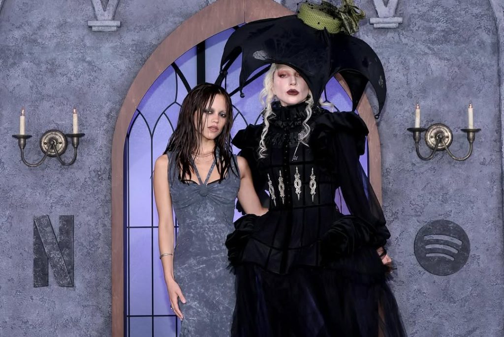 Con atuendos oscuros y dramáticos que parecían sacados de la propia Academia Nevermore, ambas estrellas hicieron que los reflectores se posaran sobre ellas. Ortega optó por un vestido de silueta clásica con detalles victorianos, mientras que Gaga elevó la extravagancia con un look teatral que fusionaba el misterio con su característico estilo irreverente.