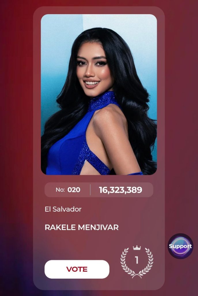 «Algo nunca antes visto en ningún concurso de belleza internacional. ¡Sigamos apoyando a nuestra representante! La candidata más votada entrará automáticamente al top 10 el día de mañana en la gran final. ¡Rakel nos podría traer a El Salvador por primera vez una corona internacional de este nivel!», escribió la página Hello Universe El Salvador en sus redes sociales.