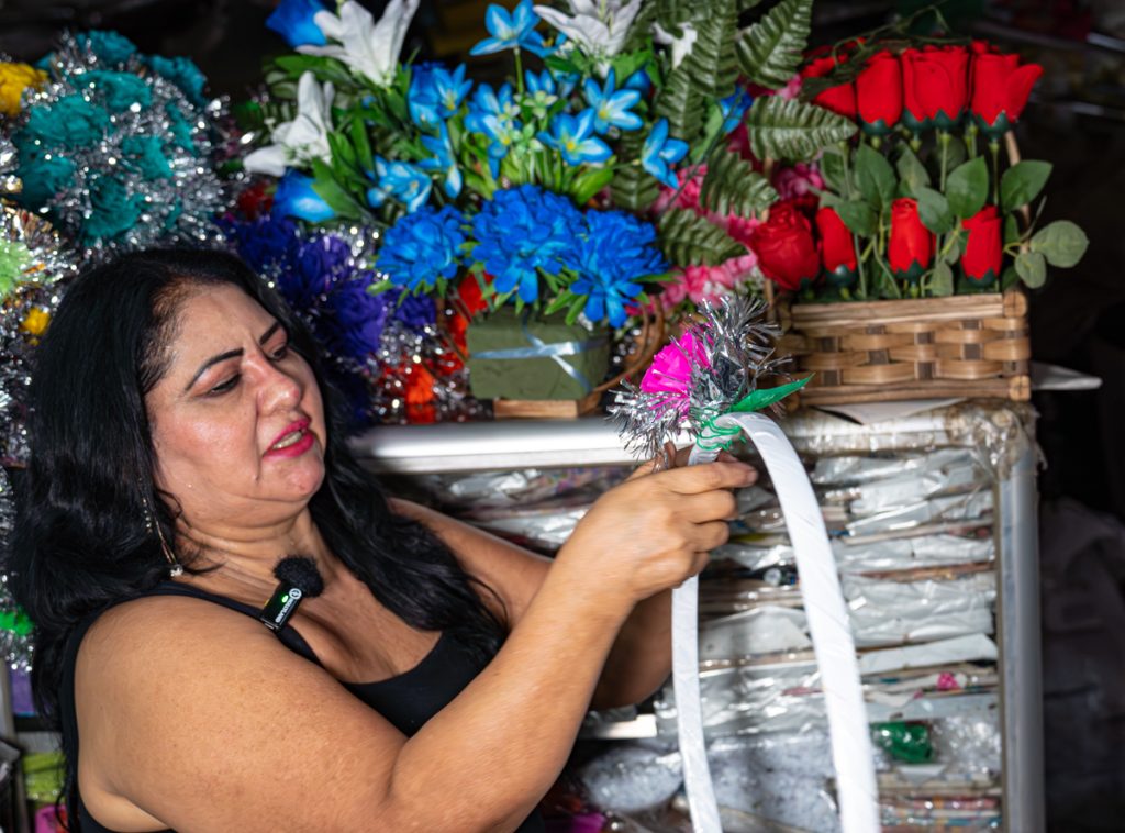 “A mi hija le sirve como una terapia y también gana, porque el dinero de sus arreglos es para ella”, sostiene. De acuerdo con Yanira, ella y su hija pueden llegar a realizar más de tres docenas de tiras de flores en una jornada y muchas veces, ese mismo día las venden en su local número 572 en el edificio nueve.