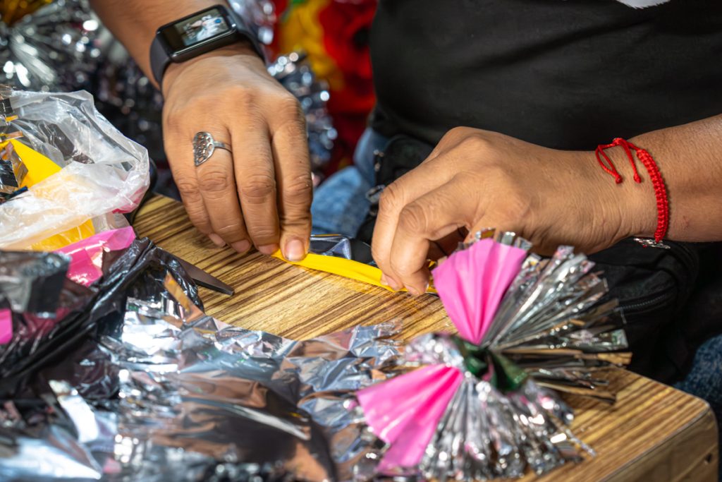 “He aprendido mucho de mi mamá porque ella empezó con esto. Así que he aprendido a elaborar una variedad de adornos con papel plateado, de bolsa plástica y alambres. En el caso de nosotros, iniciamos a trabajar en esto desde enero y vamos guardando los adornos para tener variedad para estos días”, indica Nubia.
