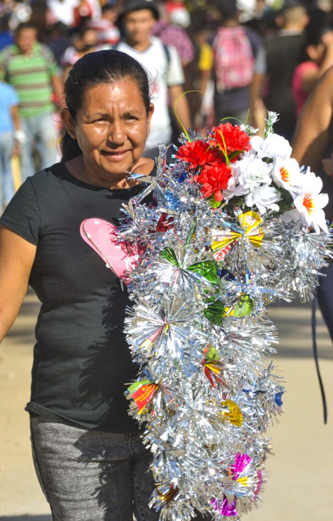“Nosotros ocupamos bastante el papel reciclable, el papel fantasía, la bolsa plástica, pajillas, alambres, hilos, agujas y otros materiales. Las flores se pican, se les ponen alambre y se van colocando en la corona”, agrega.