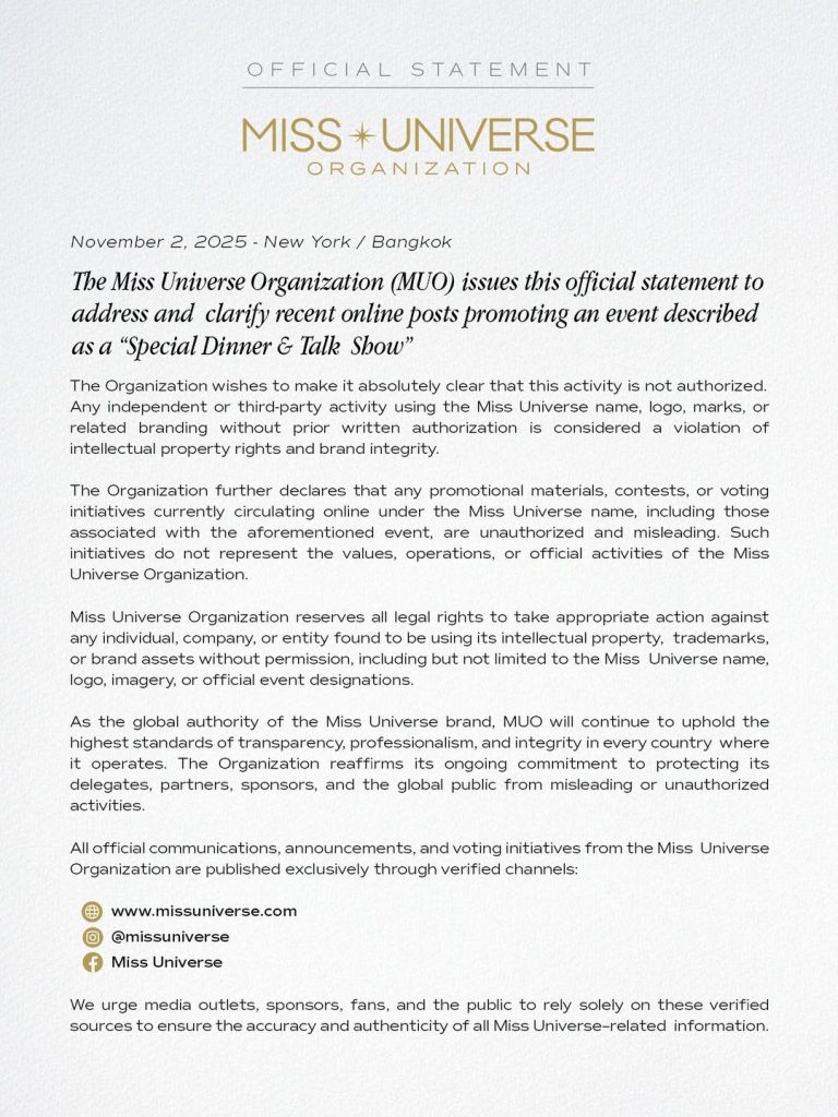 A raíz de ello, la Organización Miss Universo (MUO, por sus siglas en inglés) se pronunció en sus canales oficiales de redes sociales con el siguiente mensaje: «La organización desea dejar, absolutamente claro, que esta actividad no está autorizada. Cualquier actividad independiente o de terceros que utilice el nombre, el logotipo, las marcas o la marca relacionada de Miss Universo sin autorización previa por escrito se considera una violación de los derechos de propiedad intelectual y la integridad de la marca».