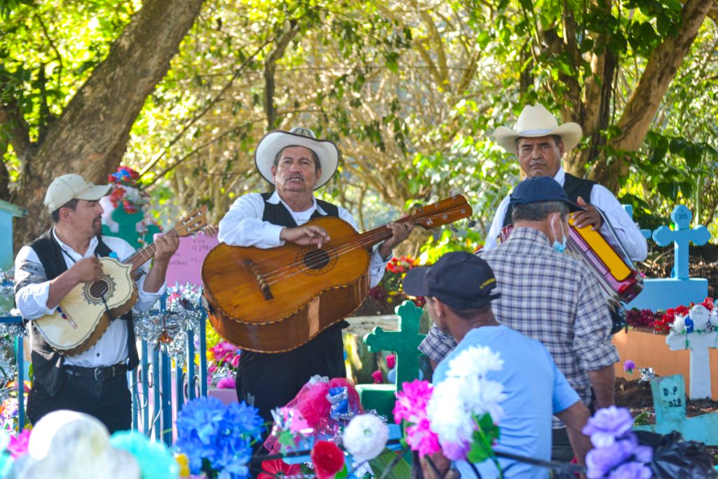 En algunos panteones es común encontrar mariachis interpretando melodías en honor a los difuntos. Estos músicos recorren el camposanto en busca de familias que deseen rendir tributo a sus seres queridos mediante las canciones que alguna vez fueron sus favoritas. Por lo general, cada interpretación tiene un costo aproximado de un dólar. Esta tradición se mantiene especialmente viva en los cementerios de los pueblos, donde los visitantes logran que la jornada no solo esté impregnada de nostalgia, sino también de alegría y celebración.
