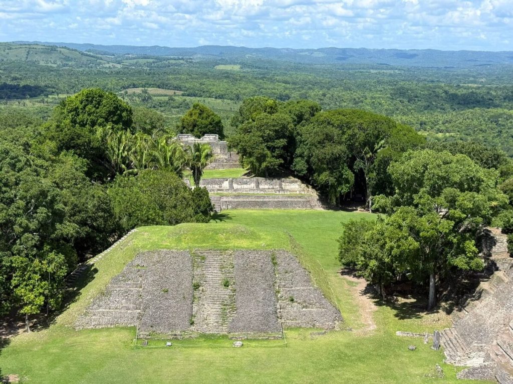 La estructura más imponente es El Castillo: una pirámide de casi 40 m de altura que domina el sitio y desde cuya cima tendrás una vista panorámica del paisaje selvático, el río Mopan y hasta Guatemala.